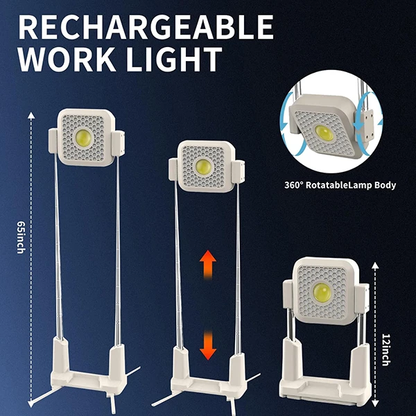 چراغ کار و مسافرتی ال ای دی قابل شارژ خورشیدی با قابلیت چرخش ۳۶۰ درجه و طراحی تلسکوپی این چراغ کار LED قابل شارژ دارای طراحی تلسکوپی است که امکان افزایش ارتفاع تا ۱.۶۵ متر را فراهم میکند، در حالی که ارتفاع جمعشده آن تنها ۳۱ سانتیمتر است. قابلیت چرخش ۳۶۰ درجه بدنه به شما این امکان را میدهد که زاویه نوردهی را بسته به نیاز خود تنظیم کنید. همچنین دارای قلاب مخفی برای استفاده راحتتر در محیطهای داخلی و خارجی است. این چراغ کار با توان ۱۵ وات و شدت نور ۱۵۰۰ لومن، روشنایی فوقالعادهای را فراهم میکند. دارای ۴ حالت نوردهی شامل نور سفید، نور گرم، ترکیبی از نور سفید و گرم، و نور قرمز چشمکزن هشدار SOS است. مناسب برای تعمیرات خودرو، روشنایی مغازه، کمپینگ، تعمیرات شغلی و امداد جادهای اضطراری. دارای باتری داخلی با ظرفیت بالا ۳۶۰۰ میلیآمپر ساعت که از طریق کابل USB و پنل خورشیدی قابل شارژ است. همچنین میتواند در مواقع اضطراری بهعنوان پاوربانک برای شارژ گوشی یا سایر دستگاههای الکترونیکی شما استفاده شود. پورت شارژ دارای نشانگر وضعیت شارژ در سمت چپ بدنه است که بررسی میزان شارژ را برای شما آسان میکند. این چراغ LED از جنس پلاستیک مقاوم ABS+PP ساخته شده است که دوام بالا و خاصیت ضد لغزش دارد و طول عمر آن را افزایش میدهد. گزینهای عالی برای هدیه دادن در مناسبتهایی چون روز پدر، کریسمس یا تولد. این چراغ بدون سیم را میتوان در مکانهایی چون باربیکیو، محل کار، تعمیر خودرو، کامیون، کارگاه، کارخانه، پروژههای ساختمانی، بازسازی داخلی و سایر مکانهایی که نیاز به نور دارند استفاده کرد.